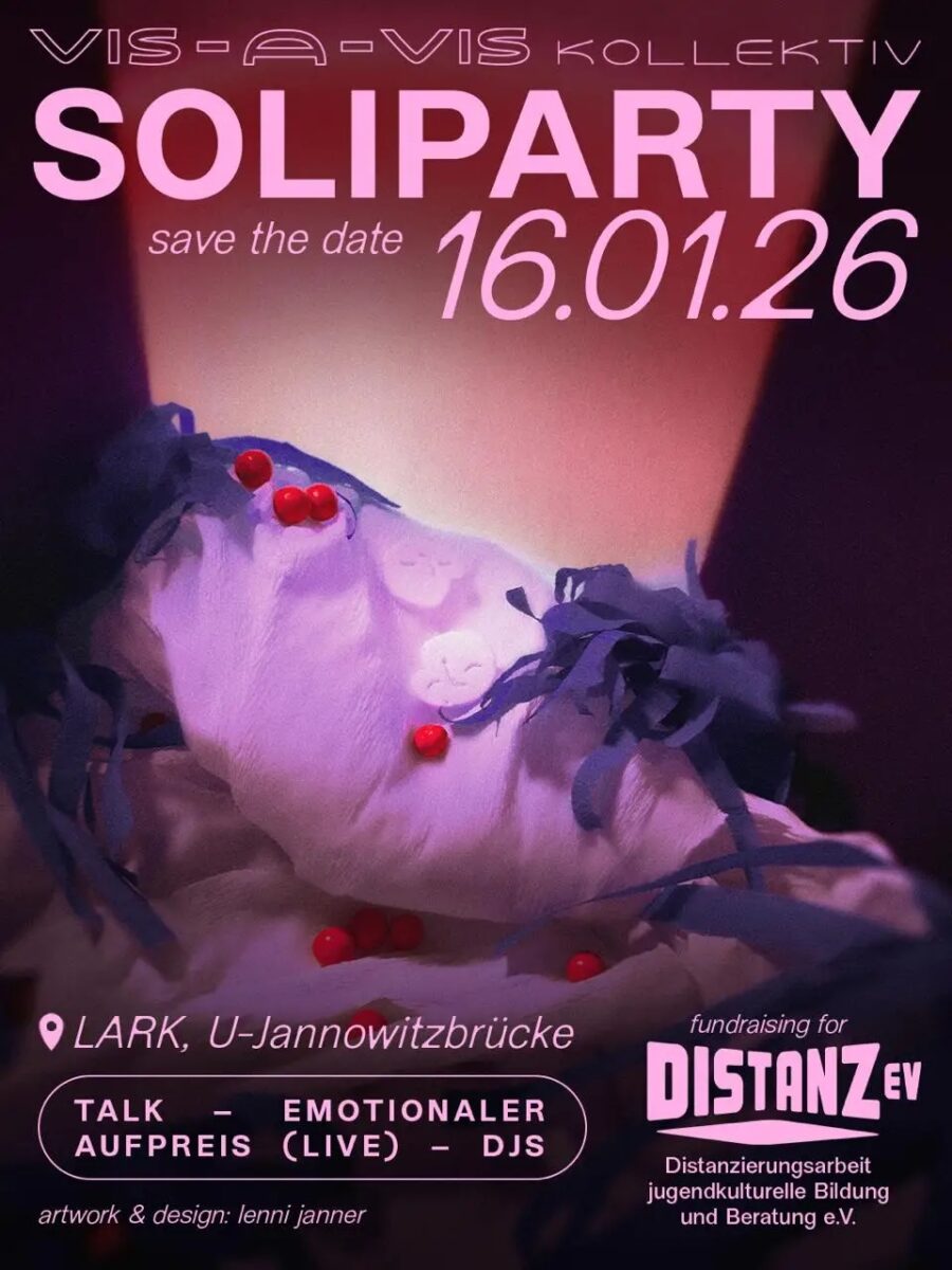 Im Januar ist es endlich soweit: am 16.1.2026 findet die nächste vis-a-vis SoliParty im LARK statt (U-Jannowitzbrücke)! Euch erwartet ein sweeter Abend mit Livemusik (Band: Emotionaler Aufpreis, DJs und einem Vortrag vom Verein Distanz e.V., für den wir dieses mal Spenden sammeln. Und neben einem großen Dancefloor gibt’s wie immer eine Chillarea mit Spiel & Spaß 🙂 Also: teilt das Event mit ALL euren Friends und tragt euch den Termin dick im Kalender ein! auf bald vis-a-vis <33